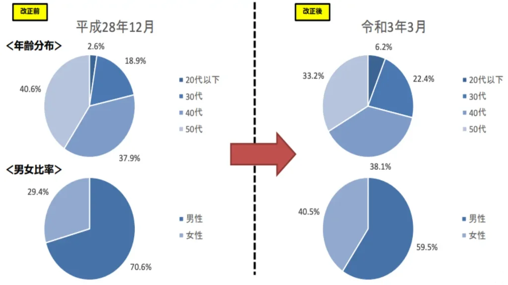 制度改正前(平成28年)は50代が40.6%と最も多かったですが、制度が普及し、若い世代の加入が増えたことで割合が変化しました。