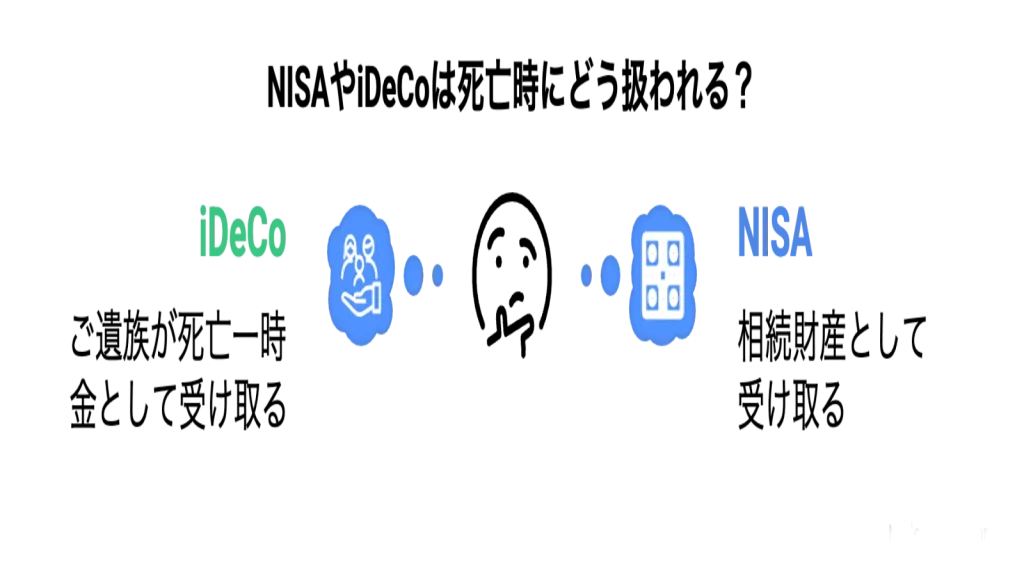 iDeCoはご遺族が「死亡一時金」として受け取り、NISAは「相続財産」として通常の相続手続きがおこなわれます。