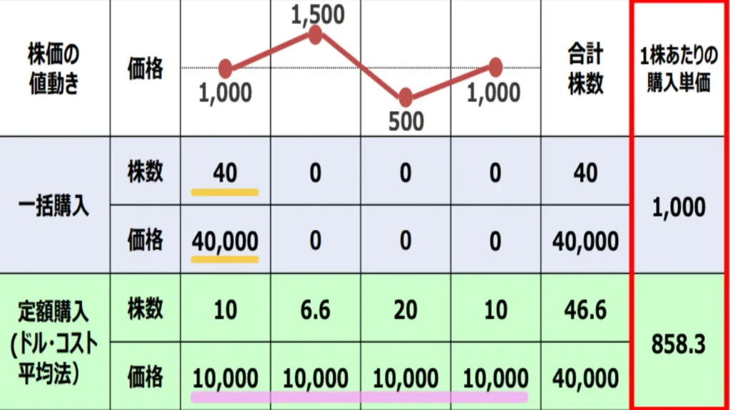 ただし、積立のような「時間の分散(高値掴みを防ぐ効果)」はありません。高い時に買ってしまうリスクには注意しましょう。