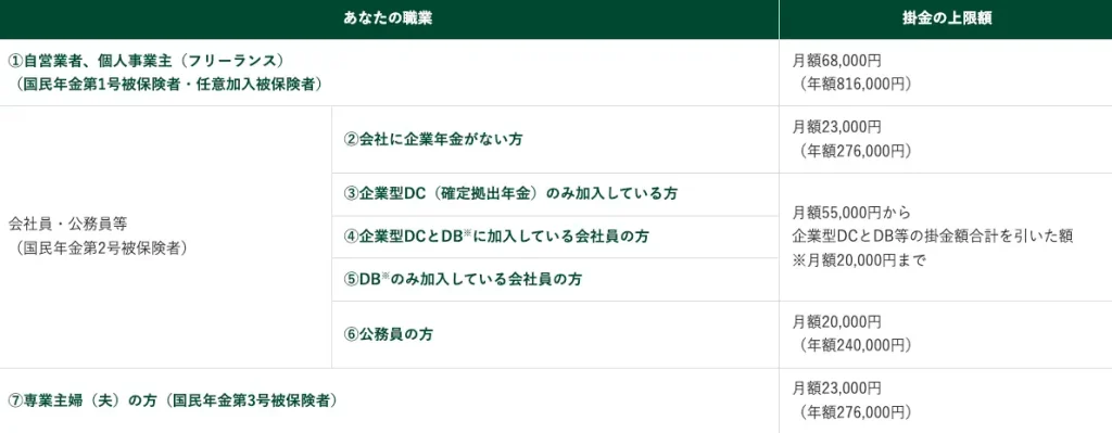 会社員や公務員の方の上限額は、勤務先の企業年金制度によって月額12,000円〜23,000円と幅があります。