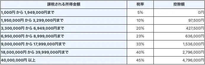 税のうち、住民税は一律10%ですが、所得税は所得金額により個々で異なります。所得税による所得税率は次の通りです。