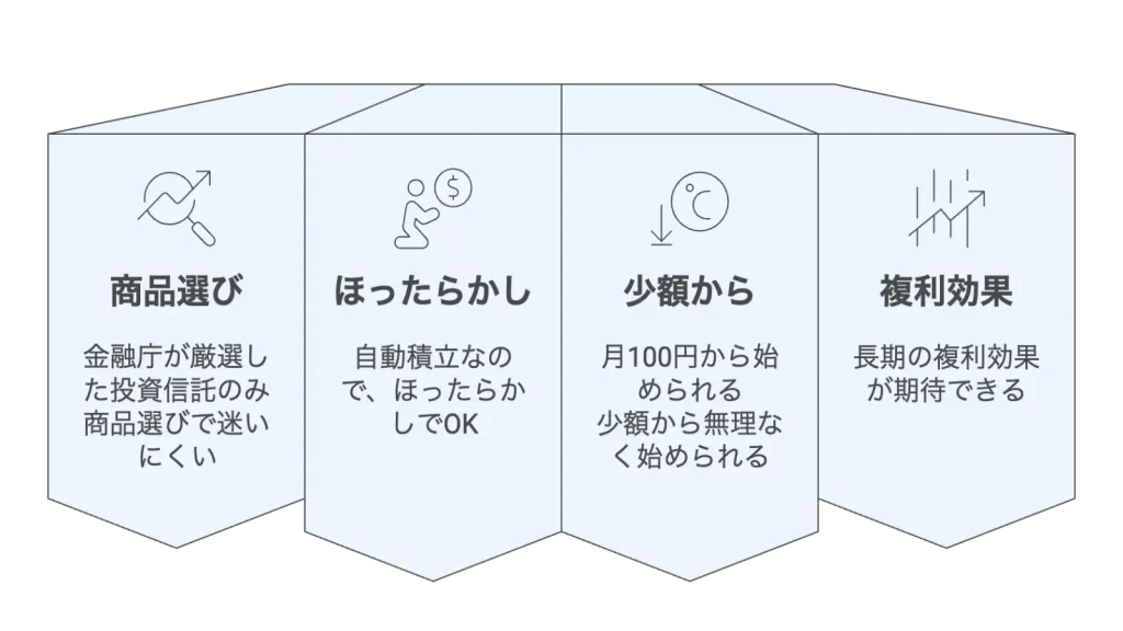 - 商品選びで迷いにくい(金融庁が厳選した投資信託のみ)